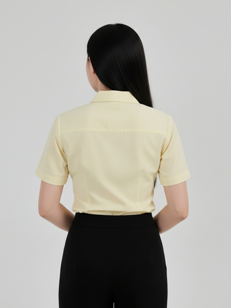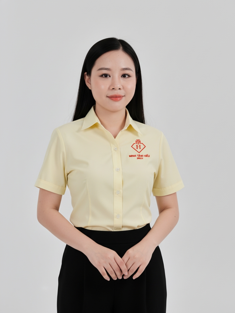 Màu vàng nhạt của áo sơ mi đồng phục công sở Minh Tâm Hiếu tạo cảm giác tươi sáng, năng động và thân thiện. Logo và tên công ty được in màu đỏ nổi bật trên ngực áo bên trái, giúp nhận diện thương hiệu dễ dàng và tạo ấn tượng mạnh mẽ với khách hàng.