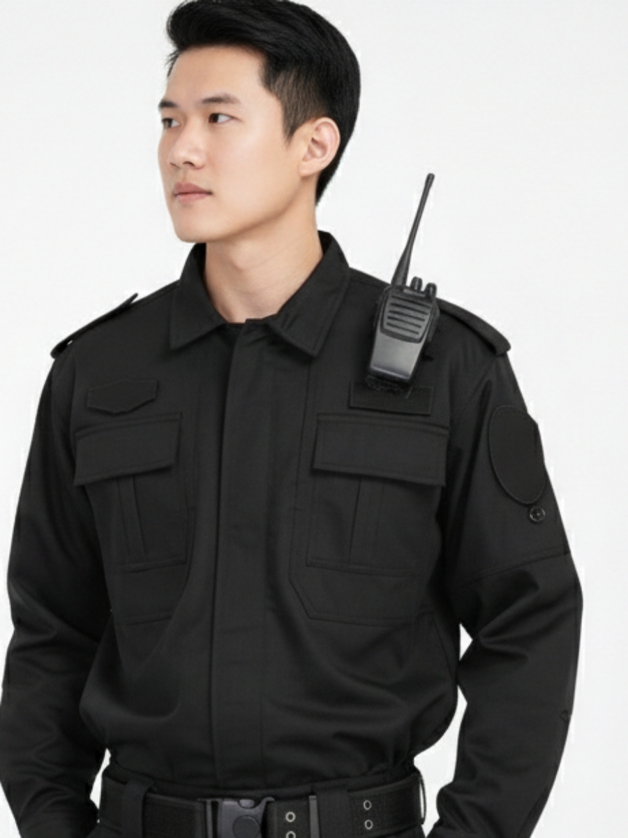 Đồng phục bảo vệ 11 có thiết kế cổ áo đứng, tạo nên vẻ ngoài nghiêm túc và chuyên nghiệp cho người mặc. Kiểu dáng áo khoác dài tay với nhiều túi tiện lợi giúp người mặc dễ dàng mang theo các vật dụng cần thiết trong công việc. Bộ đàm được gắn trên vai áo, giúp nhân viên bảo vệ luôn sẵn sàng liên lạc khi cần thiết.