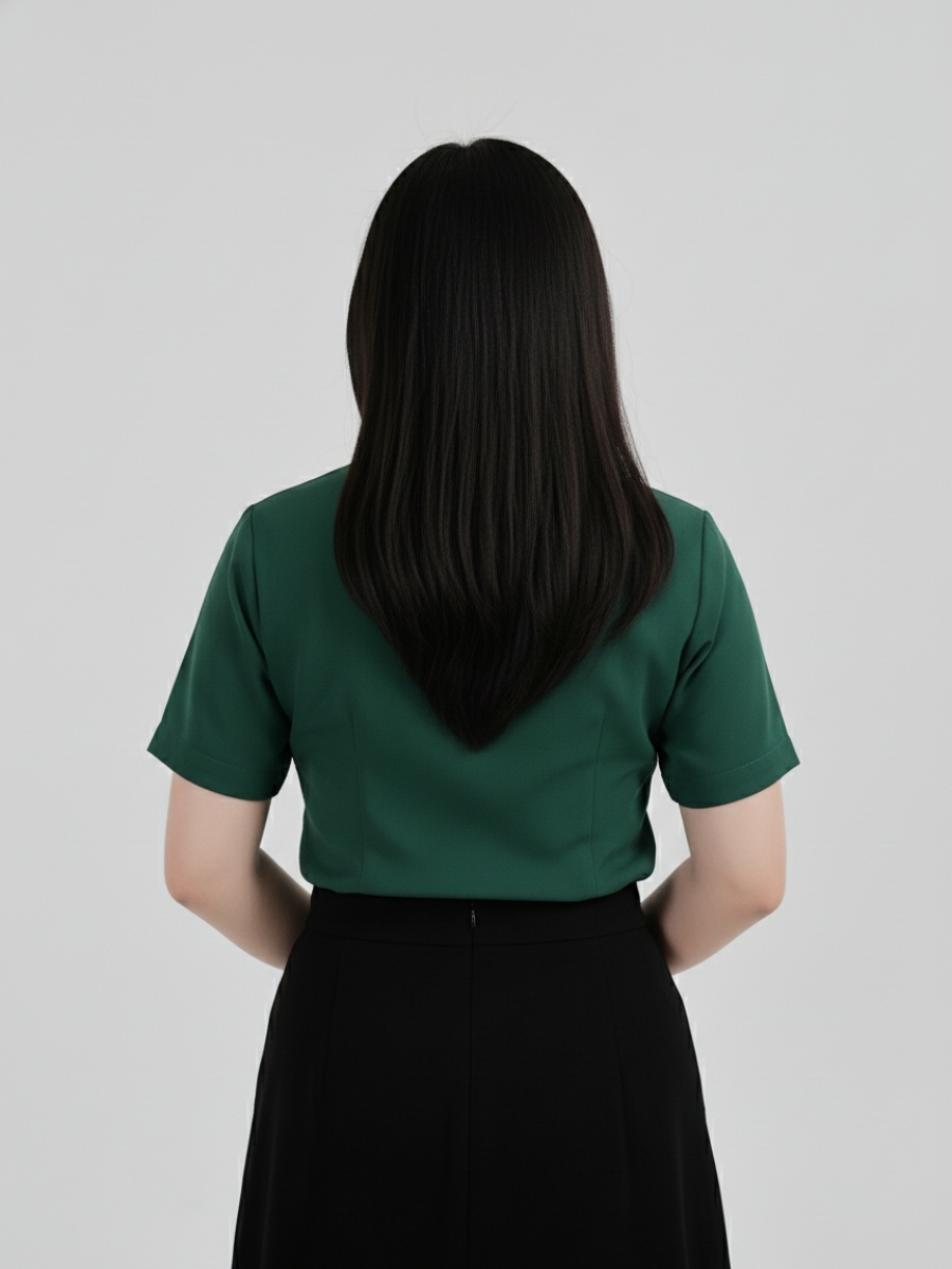 Kiểu áo dáng ôm nhẹ, vừa vặn với cơ thể, giúp tôn lên vóc dáng người mặc. Áo có hàng cúc đen phía trước, dễ dàng cởi và mặc. Thiết kế này không chỉ mang lại sự tiện lợi mà còn tạo cảm giác thoải mái, không gò bó khi làm việc. Tay áo ngắn giúp người mặc cảm thấy thoáng mát, dễ chịu trong suốt quá trình làm việc.
