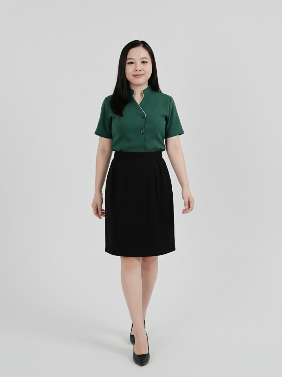 Đồng phục spa nữ màu xanh lá – 03 có thiết kế cổ áo đứng, mang lại vẻ thanh lịch và chuyên nghiệp. Cổ áo được may viền trắng tạo điểm nhấn, giúp sản phẩm trở nên nổi bật và thu hút ánh nhìn. Thiết kế cổ áo này không chỉ phù hợp với môi trường spa mà còn dễ dàng phối hợp với các phụ kiện khác như khăn quàng cổ, trang sức.