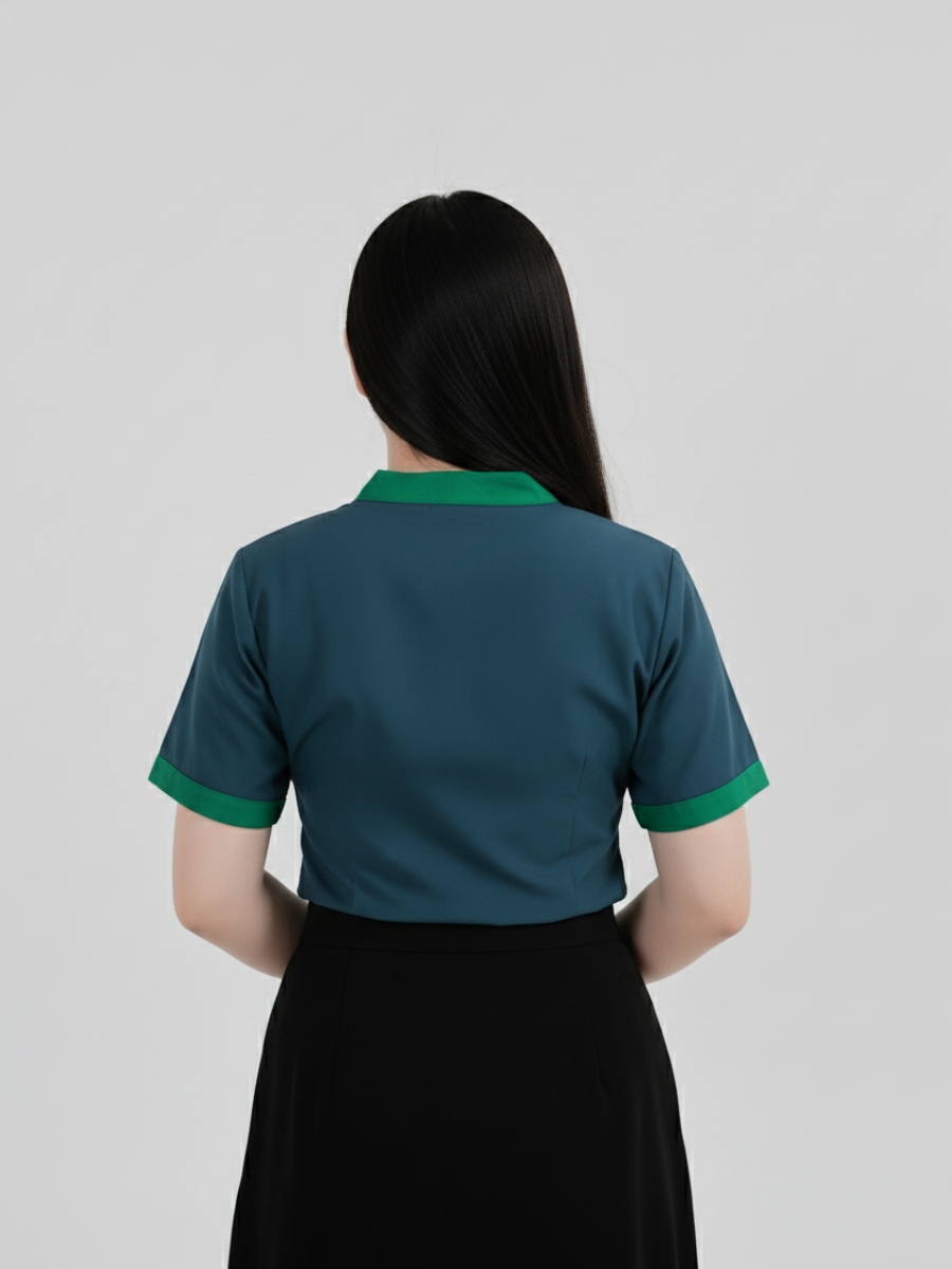 Kiểu áo cổ tàu cách điệu phối màu xanh lá cây nổi bật trên nền áo xanh đen tạo điểm nhấn độc đáo và sang trọng. Phần tay áo ngắn được bo viền cùng màu cổ áo tạo sự hài hòa và thanh lịch. Form áo suông nhẹ nhàng, không quá ôm sát giúp nhân viên thoải mái vận động.