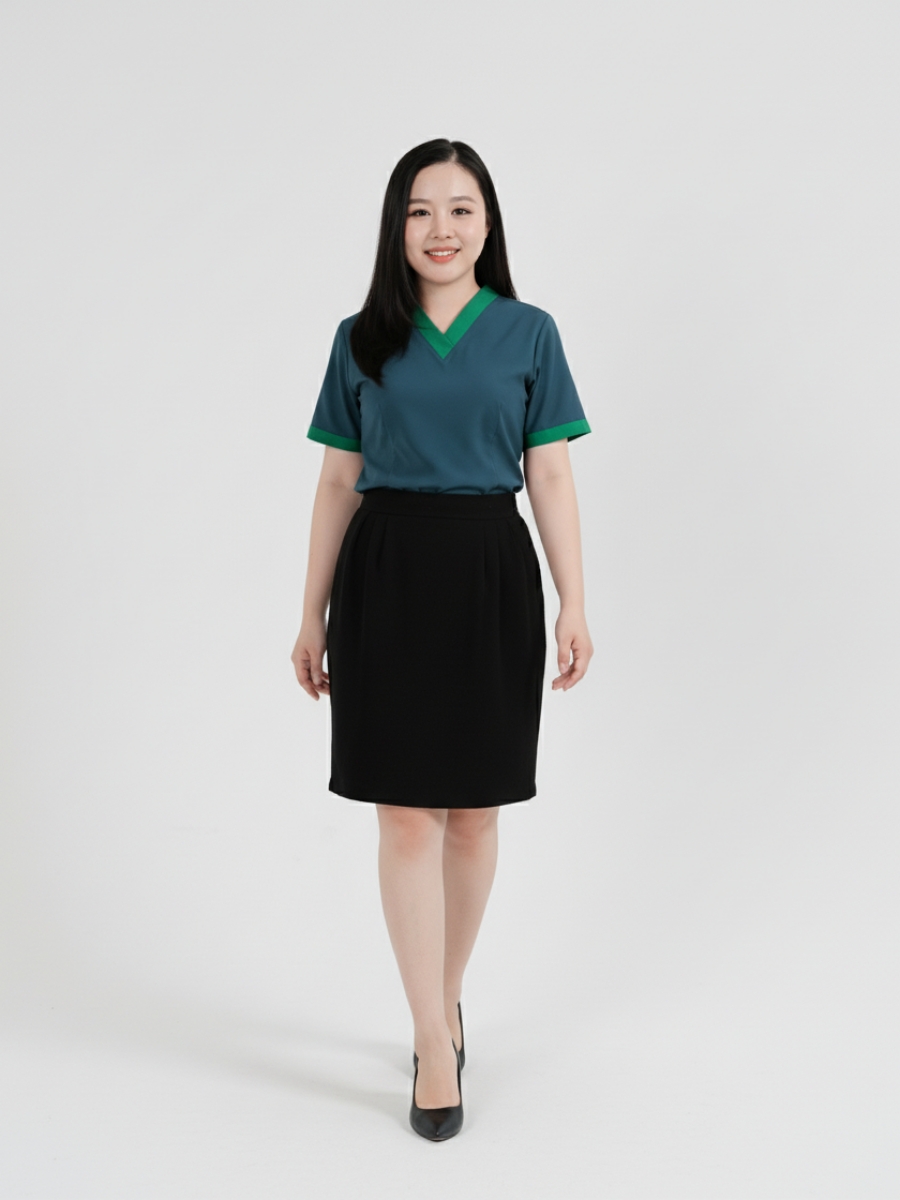 Bạn đang tìm kiếm mẫu đồng phục spa thể hiện sự chuyên nghiệp, đẳng cấp mà vẫn đảm bảo sự thoải mái cho nhân viên? Đồng phục nhân viên spa màu xanh dương phối viền cổ xanh lá – 05 với thiết kế tinh tế, chất liệu cao cấp và đường may tỉ mỉ giúp nâng tầm hình ảnh thương hiệu spa của bạn.