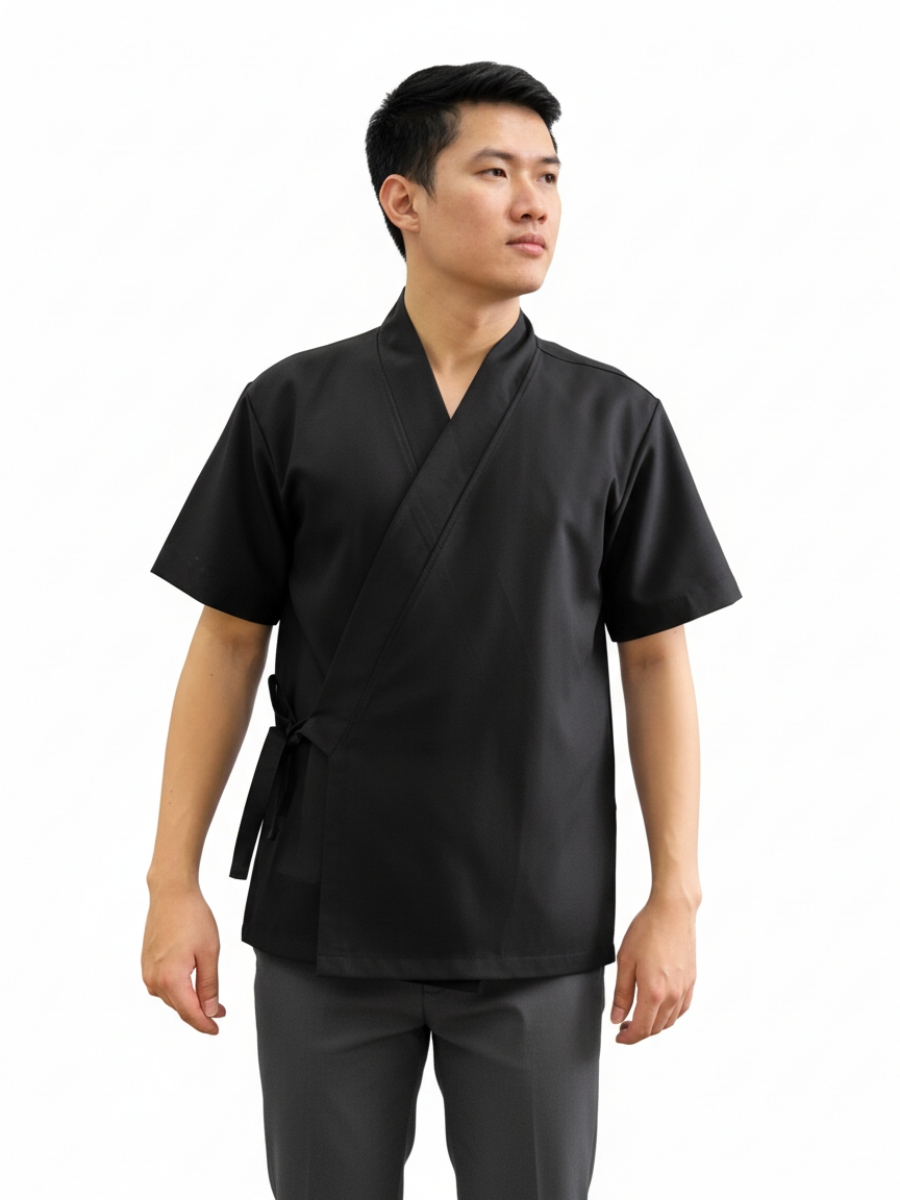 Áo đồng phục spa – 17 có thiết kế cổ áo chéo độc đáo, mang lại vẻ đẹp thanh lịch và chuyên nghiệp. Kiểu cổ áo này không chỉ giúp người mặc trông gọn gàng mà còn tạo cảm giác thoải mái, dễ chịu khi làm việc.