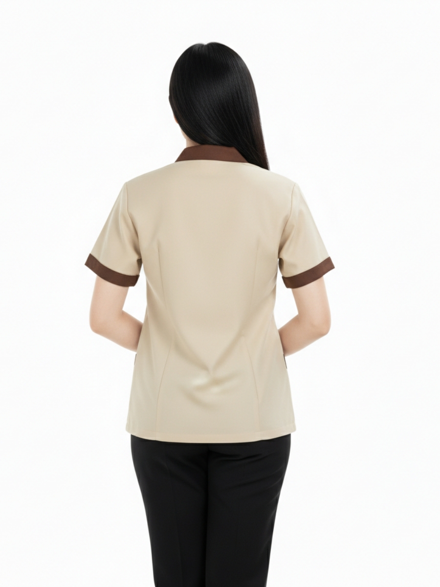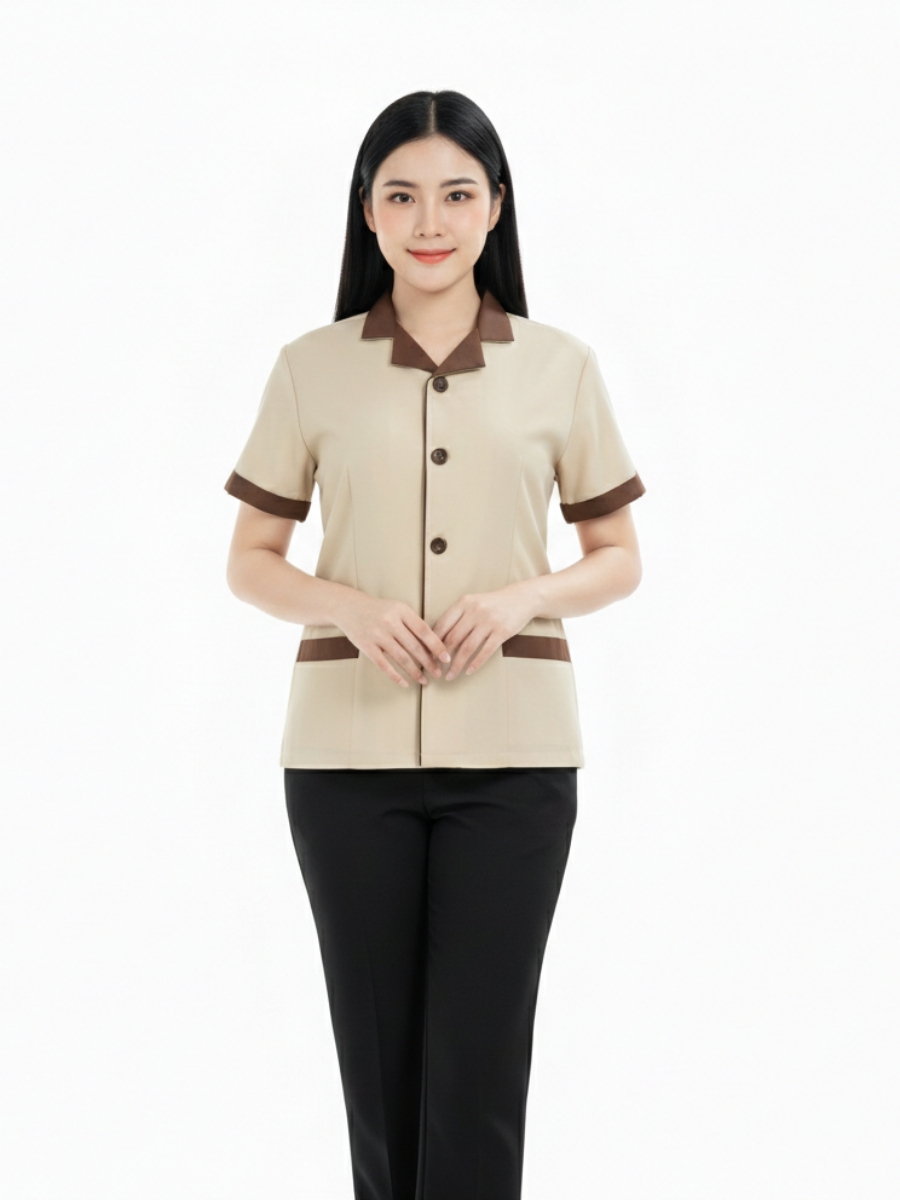 Kiểu dáng của Đồng phục tạp vụ – 05 được thiết kế ôm vừa vặn, tôn lên vóc dáng của người mặc mà không gây cảm giác gò bó. Áo có màu chủ đạo là màu be, kết hợp với các chi tiết màu đen ở hai bên hông và cổ áo, tạo nên sự hài hòa và tinh tế. Màu sắc này không chỉ dễ phối hợp với các trang phục khác mà còn mang lại vẻ ngoài thanh lịch và chuyên nghiệp.